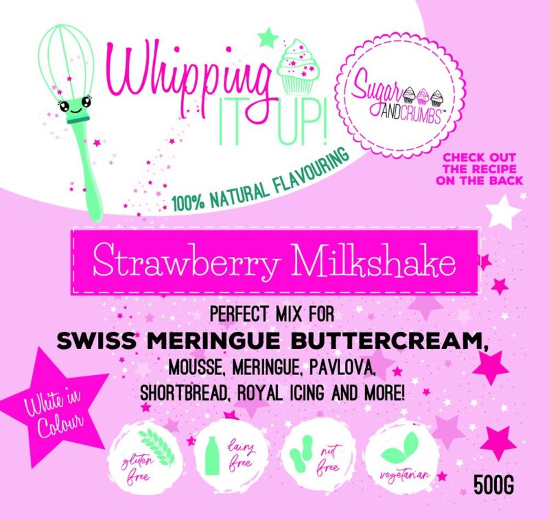 Zowel de rand om de sprinkels op vast te plakken als de toef is heerlijke luchtige smeuïge swiss merengue botercreme. Waar het normaal gesproken een hele boel tijd en inspanning kost om een goede SMBC te maken heeft Sugar and Crumbs het grootste werk al voor je verricht door de Whipping it UP mix op de markt te brengen. Waar we Sugar and Crumbs al kennen van de heerlijke icing sugar en cacao poeders waaraan op natuurlijke basis een heerlijke smaak is toegevoegd is dit een mix met eiwitpoeder. Deze mix is tevens te gebruiken voor meerdere recepten zoals o.a. macarons, merengue en pavlova.